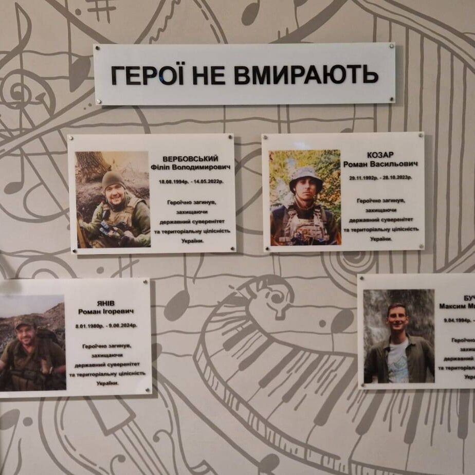 Danach folgte ein Zwischenhalt im Musiklyzeum in Lwiw, wo ich auch übernachten durfte. Ein Bild zeigt mich mit der Harfe, die ich dem Lyzeum überreichen durfte – ein anderes das traurige Bild der gefallenen Musiker.